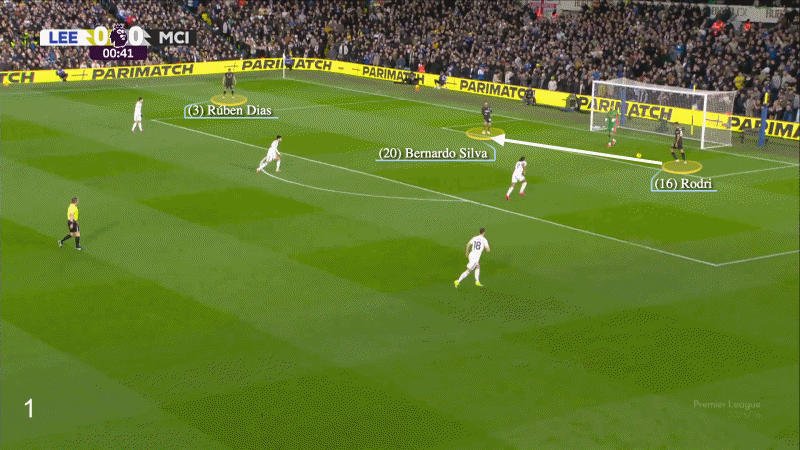 第三次尝试几乎完美地展现了瓜迪奥拉想要的效果,罗德里和B席吸引了利兹联球员的注意力,然后绕过他们,带球推进到前场并进行传球配合。